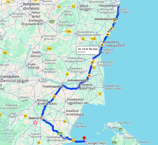 Night 1 — Arrival Chennai. Day 1 — Travel to Thiruvananthapuram, visit the Eight Lingas. Night 2 — TVM. Day 2 — Ramana Maharshi Ashram; travel to Mahabalipuram (PM). Night 3 — Mahabalipuram. Day 3 — Travel to CDM; CDM (PM). Night 4 — Kumbakonam. Day 4 — Darasuram, Pateeswaram (AM), Gangaikonda Cholapuram (PM). Night 5 — Kumbakonam. Day 5 — Swamimalai, Thirunallar, Thirukadaiyur. Night 6 — Kumbakonam. Day 6 — Tanjore (AM), Trichy & Srirangam (PM). Night 7 — Trichy. Day 7 — Travel to Karaikudi (Chettinad palace) then to Rameshwaram (PM). Night 8 — Rameshwaram. Day 8 — Rameshwaram 22 Theertham (AM), Dhanushkodi (PM), travel to Madurai. Night 9 — Madurai. Day 9 — Meenakshi Amman Temple (AM), Thirumalai Nayak Palace, Kallazhagar Temple (PM). Night 10 — Madurai. Day 10 — Fly to Chennai and onward transit.